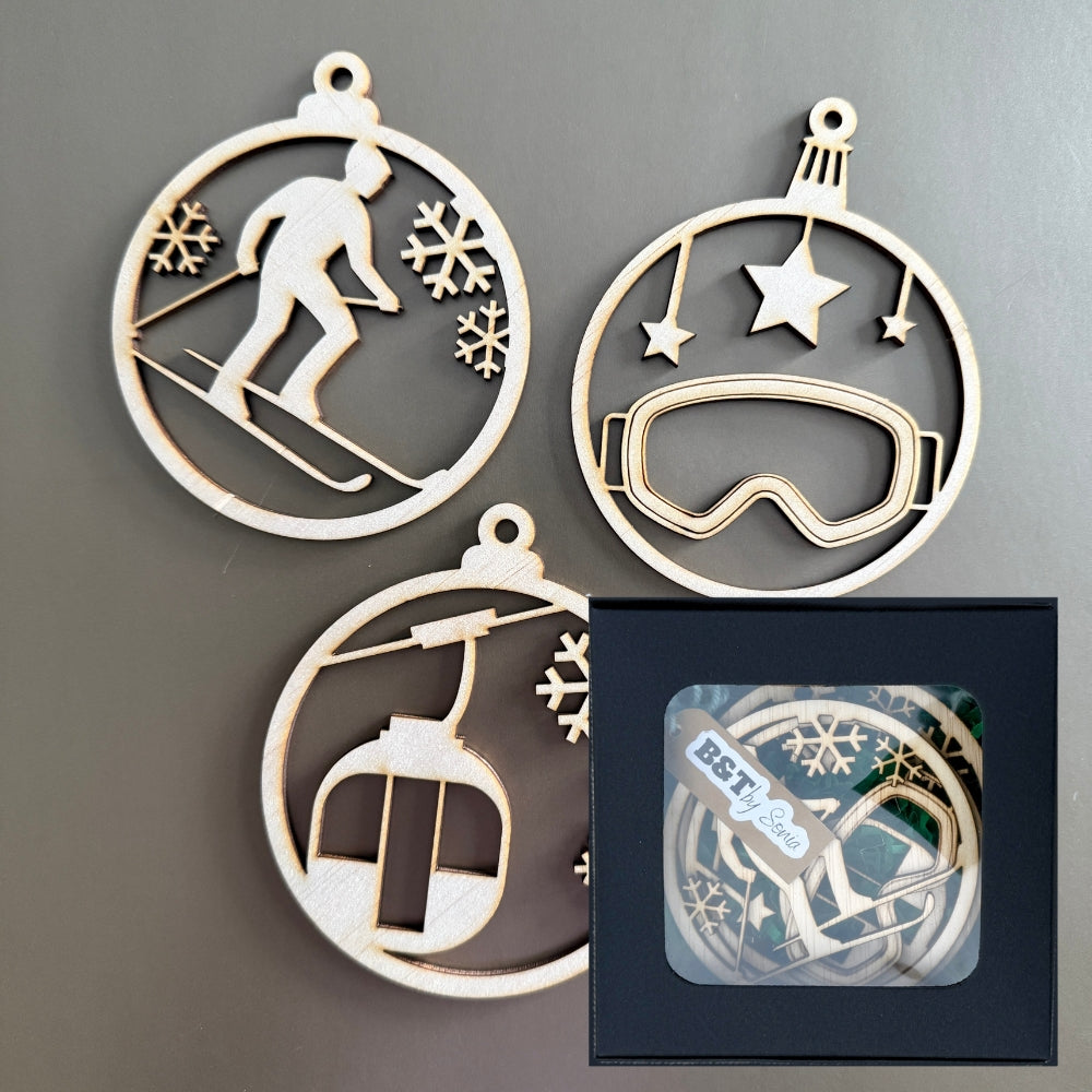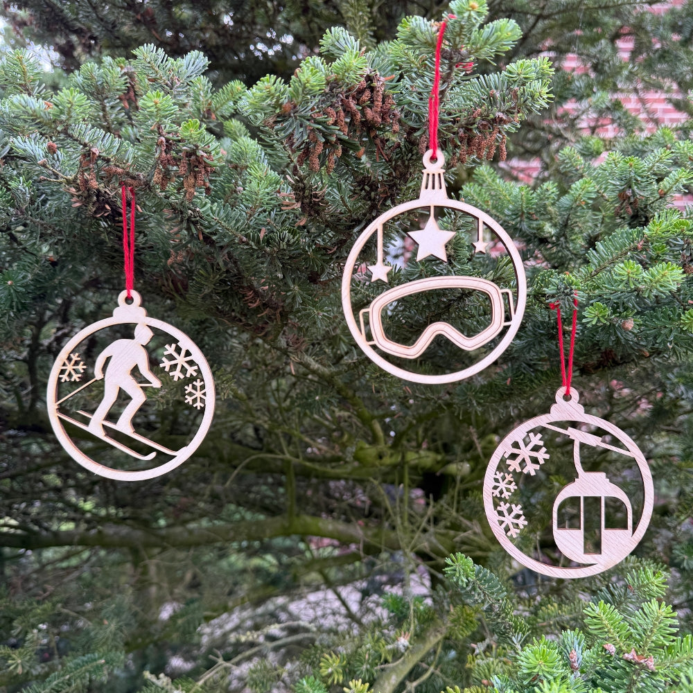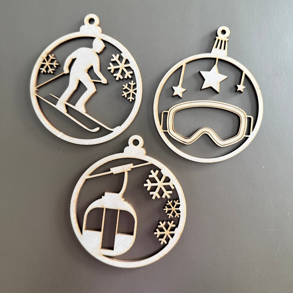 🎄 Weihnachtskugeln aus Holz – Ski-Thema (3er-Set)